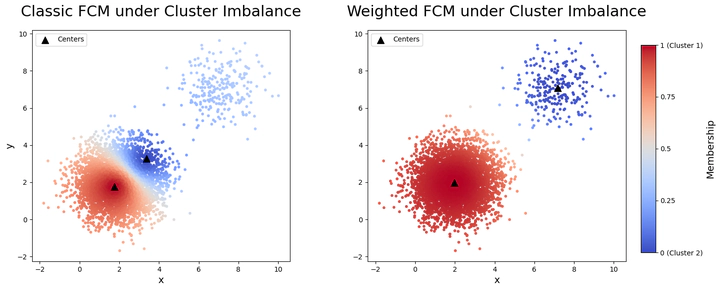 Image credit: Wu et al.Clustering is a central tool in biomedical research for discovering heterogeneous patient subpopulations, where group boundaries are often diffuse rather than sharply separated. Traditional methods produce hard partitions, whereas soft clustering methods such as fuzzy $c$-means (FCM) allow mixed memberships and better capture uncertainty and gradual transitions. Despite the widespread use of FCM, principled statistical inference for fuzzy clustering remains limited. We develop a new framework for weighted fuzzy $c$-means (WFCM) for settings with potential cluster size imbalance. Cluster-specific weights rebalance the classical FCM criterion so that smaller clusters are not overwhelmed by dominant groups, and the weighted objective induces a normalized density model with scale parameter $\sigma$ and fuzziness parameter $m$. Estimation is performed via a blockwise majorize–minimize (MM) procedure that alternates closed-form membership and centroid updates with likelihood-based updates of $(\sigma,\bw)$. The intractable normalizing constant is approximated by importance sampling using a data-adaptive Gaussian mixture proposal. We further provide likelihood ratio tests for comparing cluster centers and bootstrap-based confidence intervals. We establish consistency and asymptotic normality of the maximum likelihood estimator, validate the method through simulations, and illustrate it using single-cell RNA-seq and Alzheimer disease Neuroimaging Initiative (ADNI) data. These applications demonstrate stable uncertainty quantification and biologically meaningful soft memberships, ranging from well-separated cell populations under imbalance to a graded AD versus non-AD continuum consistent with disease progression.